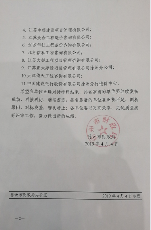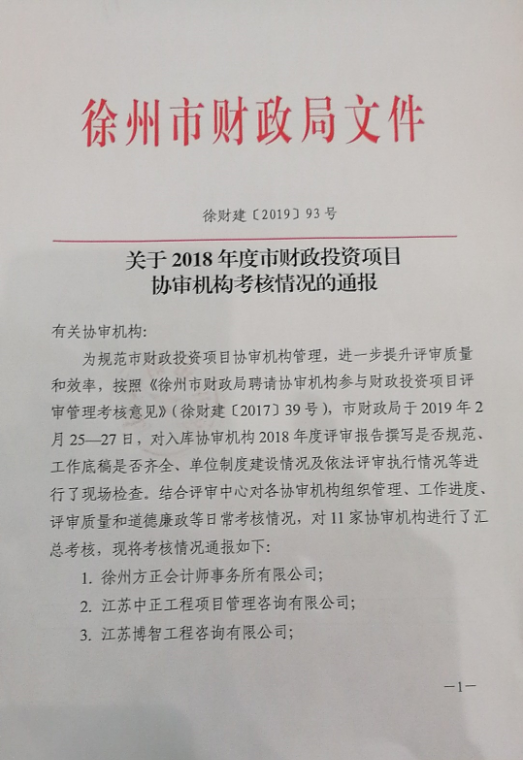 近日,由徐州市財(cái)政局組織的協(xié)審單位評比中,我所憑借自身在組織管理、工作進(jìn)度、評審質(zhì)量、道德廉政等方面的優(yōu)異表現(xiàn),榮獲本次評比第一名的好成績。